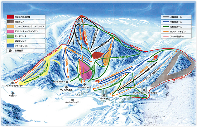 Bên cạnh đó, ảnh dưới đây là ví dụ một bản đồ gồm tất cả các コース (đường trượt) tại một điểm trượt tuyết. Khi đến đó bạn nên để ý chỉ dẫn nhé để tránh bị lạc, và biết đâu là đường trượt dễ, đâu là đường trượt dễ.
