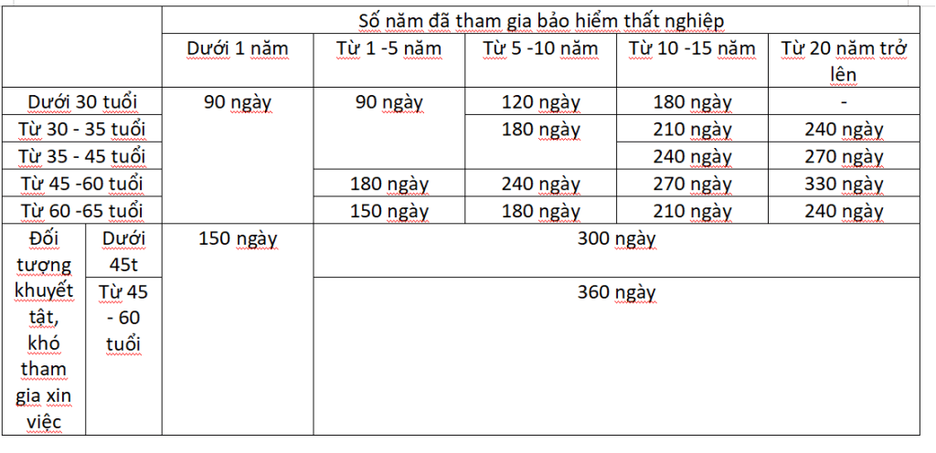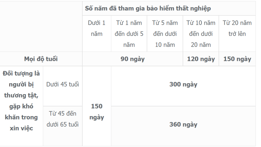 Được chia làm 2 đối tượng: Người bình thường và người bị thương tật, khó khăn trong xin việc. Số ngày nhận trợ cấp sẽ được tính dựa trên độ tuổi của người lao động và số năm tham gia bảo hiểm thất nghiệm, được quy định như sau: