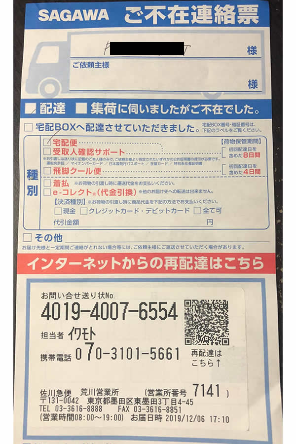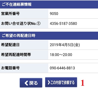 Trên phiếu 不在連絡票 (ふざいれんらくひょう) sẽ có in số điện thoại của nhân viên giao hàng cho bạn. Vì vậy, bạn có thể liên hệ trực tiếp với người phụ trách đó để hẹn ngày giờ nhận lại hàng hóa đó.