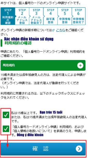 Trong phần 利用規約確認 bạn cần tích vào 2 ô trống và chọn 確認 để giao diện chuyển tiếp