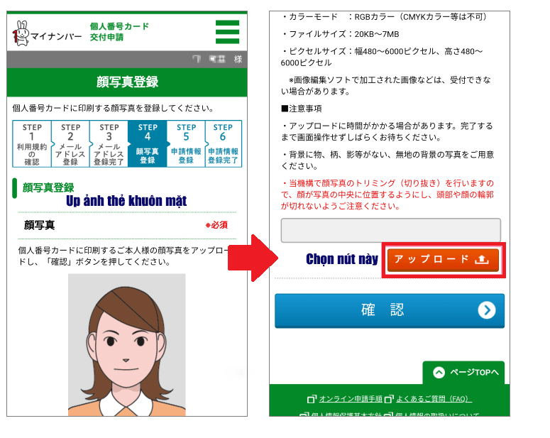 Bạn nhấn vào アップロードđể chụp hoặc up ảnh khuôn mặt của bạn lên. Nếu giao diện hiện ra dòng chữ アップロードが完了しました có nghĩa là bạn đã tải ảnh thành công và nhấn xác nhận 確認.