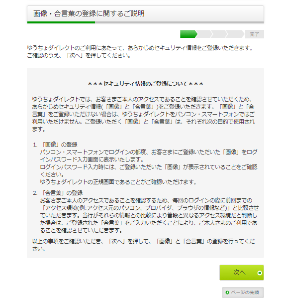 Giao diện mới sẽ hiện ra là các điều khoản của ngân hàng Yucho. Tại đây bạn sẽ tích vào ô 「ゆうちょダイレクト新規利用申し込みに関する重要事項」の内容に同意する có nghĩa là tôi đồng ý với các điều khoản của ngân hàng Yucho. Tiếp đó nhấn chọn 次へ để chuyển tiếp sang bước tiếp theo.